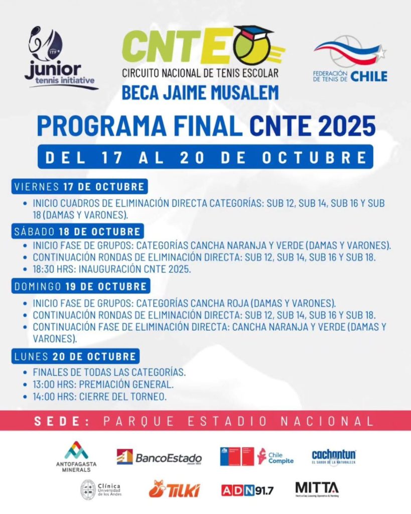 Durante cuatro intensas jornadas, los participantes medirán su talento, esfuerzo y técnica frente a los jugadores más destacados del país. La programación oficial y los cuadros de competencia están disponibles en el sitio web de la Federación de Tenis de Chile.