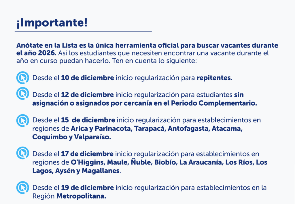 Los colegios Bulnes y Bajo Molle, pertenecientes a la Fundación Create, informan a la comunidad que el próximo 15 de diciembre se habilitará en la Región de Tarapacá la última etapa del proceso de admisión escolar “Anótate en la Lista”, instancia en la que los apoderados podrán acceder a los cupos disponibles para el año académico 2026.