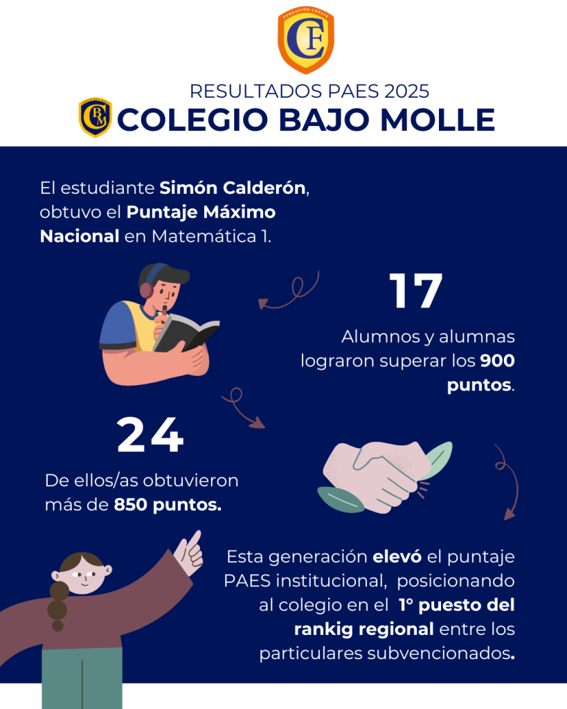 Fundación Educacional Créate y Colegio Bajo Molle de Iquique felicitan a sus estudiantes que rindieron la Prueba de Acceso a la Educación Superior (PAES 2025), y celebran los excelentes resultados obtenidos, con 17 estudiantes que alcanzaron puntajes superiores a 900 puntos y 24 sobre 850, felicitando especialmente a Simón Calderón, estudiante de 4° Medio C de la Generación 2025, quien obtuvo puntaje máximo nacional en Matemática 1 y 938 en Lenguaje.
